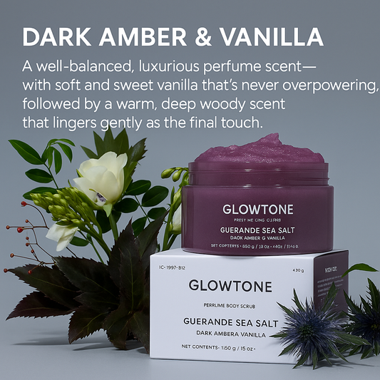 Glowtone Perfume Body Scrub Duo – Dark Amber & Vanilla + Coral Rose (Guerande Sea Salt)